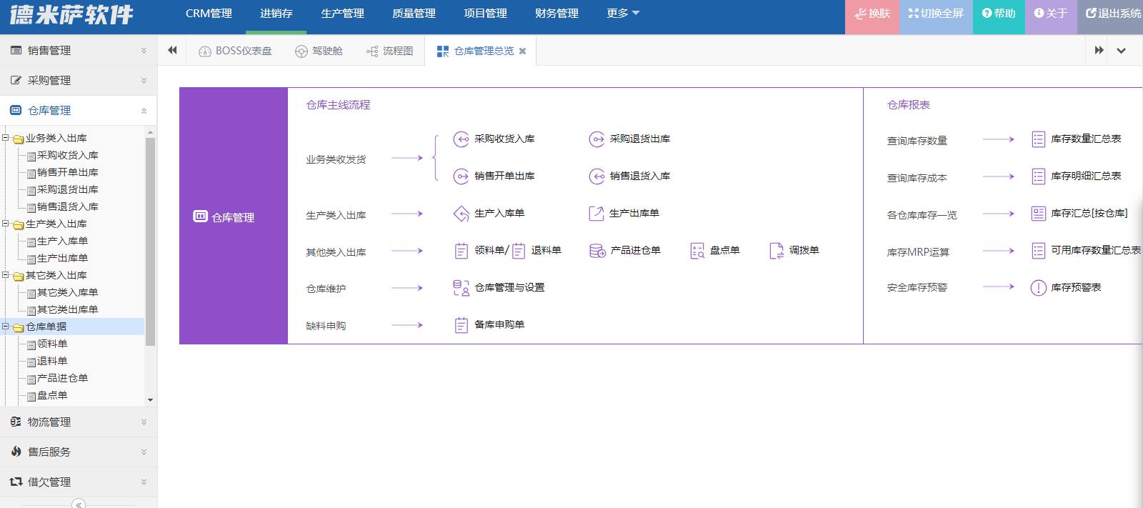 7、仓库管理:业务类入出库、采购收货入库、销售开单出库、采购退货出库、销售退货入库、其它类入出库、其它类入库单、其它类出库单、领料、退料、产品进仓、盘点单、仓库调拨、备库申购单、仓库管理、报表中心、库存明细汇总表、库存数量汇总表、库存数量汇总[类别]、库存分布汇总表、可用库存数量汇总表、呆滞品分析表、领料一览表、入出库明细汇总表、入出库数量汇总表、库存预警表。