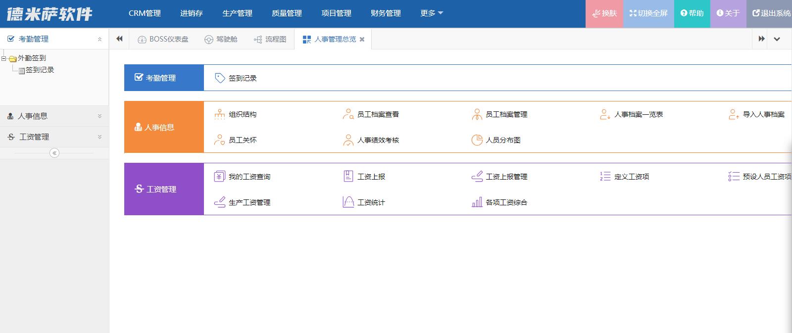 《人事管理》包含如下模块:考勤管理、外勤签到、签到记录、人事信息、组织结构、员工档案查看、员工档案管理、人事档案一览表、导入人事档案、员工关怀、人事绩效考核、人员分布图、工资管理、我的工资查询、工资管理、工资上报、工资上报管理、定义工资项、预设人员工资项、生产工资管理、工资统计、各项工资综合。